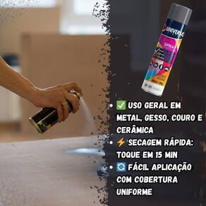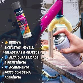 Tinta Spray 400ml Cinza Grafite Uso Geral em Aço Ferro Couro Gesso Cerâmica A Tinta Spray 400ml Cinza Grafite Uso Geral é a solução prática para renovar superfícies de metal, gesso, couro e cerâmica. Ideal para dar vida nova a bicicletas, móveis, eletrodomésticos e objetos em geral, garantindo um acabamento moderno e duradouro. Com fórmula de alta qualidade, oferece excelente aderência e acabamento Brilhante, além de resistência superior contra desgastes do dia a dia. Sua cobertura uniforme realça os detalhes e proporciona um resultado em poucas camadas. Prática e fácil de aplicar, a tinta spray seca ao toque em apenas 15 minutos, permitindo agilidade nos trabalhos e economia de tempo. O rendimento de até 2 m por demão garante maior aproveitamento do produto e ótimo custo-benefício. Diferenciais: Acabamento Brilhante com ótima aderência Alta durabilidade e resistência em ambientes internos e externos Secagem rápida e aplicação prática com cobertura uniforme Especificações TÉCNICAS: Volume: 400ml Rendimento: até 2 m por demão Superfícies indicadas: metal, gesso, couro e cerâmica Secagem: toque em 15 minutos Acabamento: Brilhante Recomendação: uso de primer para melhor desempenho Itens INCLUSOS: 06 Tintas Spray 400ml Cinza Grafite Uso Geral