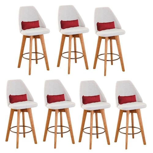 Kit 07 Banquetas Alta Maya Giratória Com Encosto Linho Bege Claro E Almofada Corino Vermelho - Aurora Line Banqueta Maya Giratória - Aurora Line A Banqueta Maya possui assento e pés em madeira eucalipto com sistema giratório! Os pés contam com um reforço que proporciona um suporte de peso de até 120 Kgs.O assento é revestido com espuma D-23. Além de bonita e charmosa, vai trazer para seu ambiente elegância e proporcionará conforto para sua família e amigos nos momentos de lazer.
