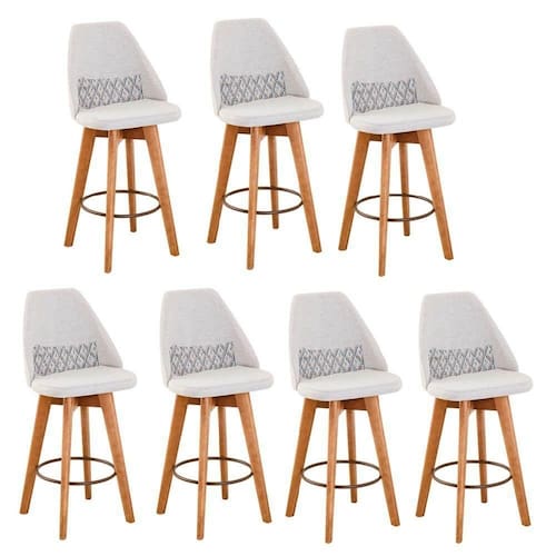 Kit 07 Banquetas Alta Maya Giratória Com Encosto Gourmet Linho Bege E Almofada Zigzag - Gat Magazine Banqueta Maya Giratória - GAT MAGAZINE A Banqueta Maya possui assento e pés em madeira eucalipto com sistema giratório! Os pés contam com um reforço que proporciona um suporte de peso de até 120 Kgs.O assento é revestido com espuma D-23. Além de bonita e charmosa, vai trazer para seu ambiente elegância e proporcionará conforto para sua família e amigos nos momentos de lazer.