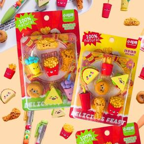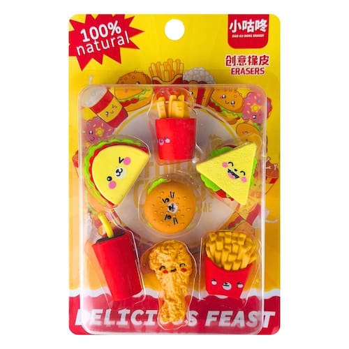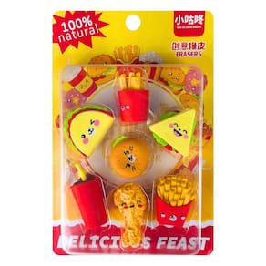 Com 07 mini borrachas personalizadas em formato de comida, como fritas e refri, essa caixa de borracha vai deixar seu material escolar ainda mais criativo.