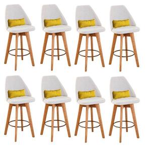 Kit 08 Banquetas Alta Maya Giratória Com Encosto Linho Bege Claro E Almofada Suede Amarelo - Gat Magazine Banqueta Maya Giratória - GAT MAGAZINE A Banqueta Maya possui assento e pés em madeira eucalipto com sistema giratório! Os pés contam com um reforço que proporciona um suporte de peso de até 120 Kgs.O assento é revestido com espuma D-23. Além de bonita e charmosa, vai trazer para seu ambiente elegância e proporcionará conforto para sua família e amigos nos momentos de lazer.
