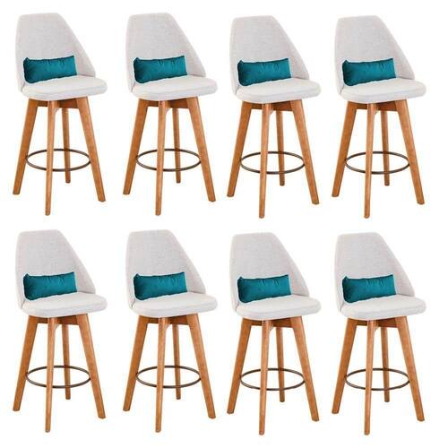 Kit 08 Banquetas Alta Maya Giratória Com Encosto Linho Bege Claro E Almofada Suede Azul Turquesa - Gat Magazine Banqueta Maya Giratória - GAT MAGAZINE A Banqueta Maya possui assento e pés em madeira eucalipto com sistema giratório! Os pés contam com um reforço que proporciona um suporte de peso de até 120 assento é revestido com espuma D-23. Além de bonita e charmosa, vai trazer para seu ambiente elegância e proporcionará conforto para sua família e amigos nos momentos de lazer.