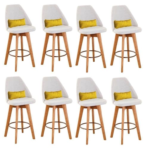 Kit 08 Banquetas Alta Maya Giratória Com Encosto Gourmet Linho Bege E Almofada Sintético Amarelo - Gat Magazine Banqueta Maya Giratória - GAT MAGAZINE A Banqueta Maya possui assento e pés em madeira eucalipto com sistema giratório! Os pés contam com um reforço que proporciona um suporte de peso de até 120 Kgs.O assento é revestido com espuma D-23. Além de bonita e charmosa, vai trazer para seu ambiente elegância e proporcionará conforto para sua família e amigos nos momentos de lazer.