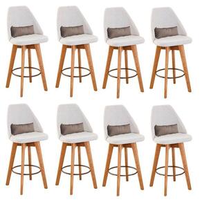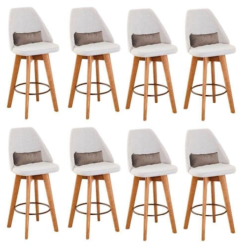 Kit 08 Banquetas Alta Maya Giratória Com Encosto Gourmet Linho Bege E Almofada Sintético Bege - Gat Magazine Banqueta Maya Giratória - GAT MAGAZINE A Banqueta Maya possui assento e pés em madeira eucalipto com sistema giratório! Os pés contam com um reforço que proporciona um suporte de peso de até 120 Kgs.O assento é revestido com espuma D-23. Além de bonita e charmosa, vai trazer para seu ambiente elegância e proporcionará conforto para sua família e amigos nos momentos de lazer.