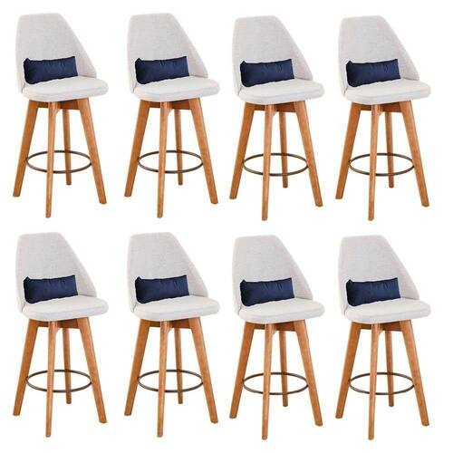 Kit 08 Banquetas Alta Maya Giratória Com Encosto Gourmet Linho Bege E Almofada Suede Azul Marinho - Gat Magazine Banqueta Maya Giratória - GAT MAGAZINE A Banqueta Maya possui assento e pés em madeira eucalipto com sistema giratório! Os pés contam com um reforço que proporciona um suporte de peso de até 120 Kgs.O assento é revestido com espuma D-23. Além de bonita e charmosa, vai trazer para seu ambiente elegância e proporcionará conforto para sua família e amigos nos momentos de lazer.