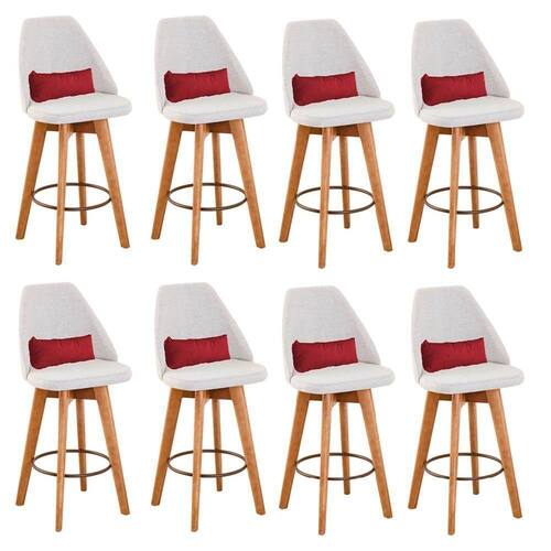 Kit 08 Banquetas Alta Maya Giratória Com Encosto Gourmet Linho Bege E Almofada Corino Vermelho - Gat Magazine Banqueta Maya Giratória - GAT MAGAZINE A Banqueta Maya possui assento e pés em madeira eucalipto com sistema giratório! Os pés contam com um reforço que proporciona um suporte de peso de até 120 assento é revestido com espuma D-23. Além de bonita e charmosa, vai trazer para seu ambiente elegância e proporcionará conforto para sua família e amigos nos momentos de lazer.