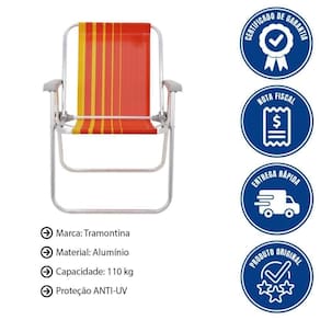 - Com a cadeira de praia Tramontina Samoa Alta em alumínio com assento laranja e amarelo você terá momentos de lazer deliciosos à beira-mar, piscina ou num acampamento com os amigos.