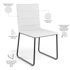Color: Branco | ColorFamily: Branco | ColorSimple: Branco | ColorSupplier: Branco | Material: Estrutura em Madeira, Revestimento em Facto e espuma | MaterialFamily: Madeira e Espuma | Model: Maya | OriginCountry: Nacional | OriginState: PR | ProductContents: 02 Cadeiras | ProductHeight: 174 cm | ProductInstructions: Produto para uso em ambiente interno, nao devendo ficar exposto ao sol, calor e umidade excessivos. | ProductLength: 106 cm | ProductWarranty: 90 dias após o recebimento do produto | ProductWeight: 52,8 Kg | ProductWidth: 45 cm | SizeDescription: Altura: 174 cm x Largura: 45 cm x Profundidade: 106 cm | SupplierSimpleName: Kit 08 Cadeiras Decorativa Estofada Para Sala De Jantar Preto Maya L02 Facto Branco - Lyam Decor