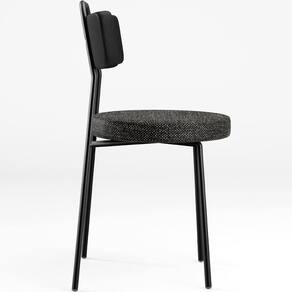 Revestimento do encosto em Couríssimo na cor Preto e do assento em Linho na cor Chumbo, com acabamento semi brilho.