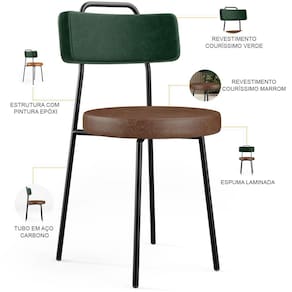 Revestimento do encosto em Facto na cor Verde Musgo e do assento em Couríssimo na cor Marrom, com acabamento semi brilho.