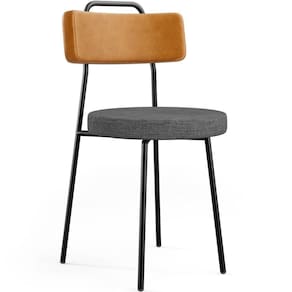 Revestimento do encosto em Couríssimo na cor Whisky e do assento em Linho na cor Cinza Escuro, com acabamento semi brilho.