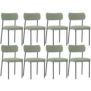 Encosto e assento estofados com espuma laminada. Estrutura fixa em aço carbono com pintura epóxi na cor preto. Revestimento em Bouclê na cor Oliva. Peso suportado: Até 120 kg.