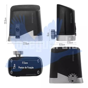 CARACTERÍSTICAS DO MOTOR • Potência de 0,25 ou 1/4 CV (portões até 300kg balanceado) • Motor: Monofásico 60Hz • Potência nominal (consumo): 127V (335W) / 220V (460W) • Corrente Nominal: 127V (2,86A) / 220V (2,15A) • Rotação do motor 1740 RPM • Peso do portão: 300Kg • Redução: 1:24 • Proteção: IPX 4 • Abre portão de 3m em 12,9 seg. • Suporta até 30 aberturas por hora (ciclos/hora) • Rotação do motor 1740 RPM • Capacitor: 127V - 25µF / 220V - 12µF • Fim de curso Analógico (Reed Switch) • Engrenagem externa 14 dentes em alumínio • Coroa interna de Nylon com alma metálica