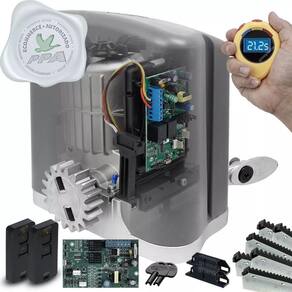 ITENS INCLUSOS 01 Motor PPA DZ Rio 400 KL Z18 1/4HP 01 Placa Eletrônica de comando PPA (testada e codificada com os controles) 01 Capacitor 01 Conjunto de Sensor fim de curso (Instalado) 02 Ímãs com suporte para o sensor fim de curso 06 Metros de cremalheira (50cm cada barra) 02 Controles pretos c/ suporte (testados e codificados com a placa) 02 Chaves de destravamento 01 Manual de operações