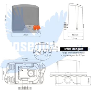 CARACTERÍSTICAS DO MOTOR • Potência de 0,5 ou 1/2 HP (portões até 700kg balanceado) • Motor: Monofásico 60Hz • Consumo (A): 2,86A - 127V / 2,15A - 220V • Peso do portão: 700Kg • Redução: 1:23 • Exemplo de tempo de abertura/fechamento (4 metros)*: 14,1 segundos • Exemplo de cclo de abre e fecha até 50 ciclos/hora • Rotação do motor 1740 RPM • Capacitor: 127V - 35µF / 220V - 12µF • Fim de curso Híbrido (analógico e digital) • Engrenagem externa 18 dentes em alumínio • Coroa interna de Nylon com alma metálica
