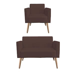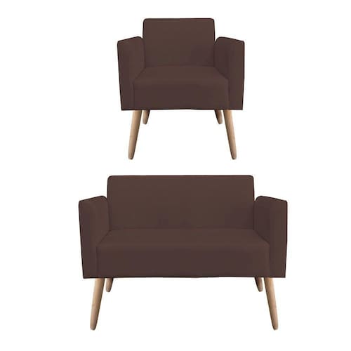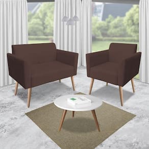 Kit 01 Namoradeira e 01 Poltrona Marisa Suede Marrom Pés Palito Natural D'Rossi