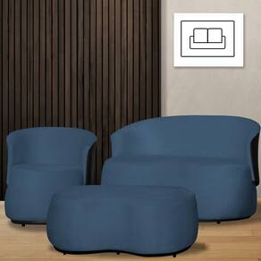 Kit 1 Poltrona 1 Namoradeira e 1 Puff Grande Decorativo Estilo Orgânico Beatriz Suede Composê Corino Preto - Estopar - Azul Royal