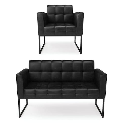Você gosta de colecionar vários momentos memoráveis com sua família e amigos? Que tal recebê-los, com móveis de altíssima qualidade que só a DRossi tem? O Kit 01 Namoradeira e 01 Poltrona Elisa é adequado para você! Seu design retrô é a grande tendência do momento. Pode ser utilizado em diversos espaços da casa, em salas, hall de entrada, quartos, cozinhas, varanda, sacada, escritório, dentre outros. Contém as seguintes características: A estrutura é feita de madeira de Eucalipto 100% de reflorestamento, e a Base Metálica Industrial Preto, além de ser resistente e durável, suporta em média até 120 kg. Assento, encosto e braços, contém enchimento de espuma D-23 e é estofado em tecido Corano, no tom Preto, que oferece muito conforto e resistência ao sentar, com aquela sensação de maciez e aconchego. Possui também, detalhes de costura no encosto e assento, resultando em um acabamento impecável, conferindo muito mais valor e elegância ao seu espaço. Para complementar a decoração com esse lindo kit, a dica é utilizar mantas, almofadas ou vasinho de flor. E pronto, seu cantinho estará perfeito para descansar e relaxar! Aqui, você encontra várias opções, para que seus amigos e familiares se sintam acolhidos. Garanta já seu kit.