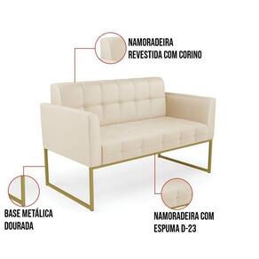 Você gosta de colecionar vários momentos memoráveis com sua família e amigos? Que tal recebê-los, com móveis de altíssima qualidade que só a DRossi tem? O Kit 01 Namoradeira e 01 Poltrona Elisa é adequado para você! Seu design retrô é a grande tendência do momento. Pode ser em diversos espaços da casa, em salas, hall de entrada, quartos, cozinhas, varanda, sacada, escritório, dentre outros. Contém as seguintes características: A estrutura é feita de madeira de Eucalipto 100% de reflorestamento, e a Base Metálica Industrial Dourado, além de ser resistente e durável, suporta em média até 120 kg. Assento, encosto e braços, contém enchimento de espuma D-23 e é estofado em tecido Corino, no tom Bege, que oferece muito conforto e resistência ao sentar, com aquela sensação de maciez e aconchego. Possui também, detalhes de costura no encosto e assento, resultando em um acabamento impecável, conferindo muito mais valor e elegância ao seu espaço. Para complementar a decoração com esse lindo kit, a dica é utilizar mantas, almofadas ou vasinho de flor. E pronto, seu cantinho estará perfeito para descansar e relaxar! Aqui, você encontra várias opções, para que seus amigos e familiares se sintam acolhidos. Garanta já seu kit.