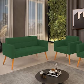 Você gosta de colecionar vários momentos memoráveis com sua família e amigos? Que tal recebê-los, com móveis de altíssima qualidade que só a DRossi tem? O Kit 01 Namoradeira e 01 Poltrona Elisa é adequado para você! Seu design retrô é a grande tendência do momento. Pode ser em diversos espaços da casa, em salas, hall de entrada, quartos, cozinhas, varanda, sacada, escritório, dentre outros. Contém as seguintes características: A estrutura é feita de madeira de Eucalipto 100% de reflorestamento, e os Pés Palito Castanho, além de serem resistentes e duráveis, suportam em média até 120 kg. Assento, encosto e braços, contém enchimento de espuma D-23 e é estofado em tecido Veludo, no tom Verde, que oferece muito conforto e resistência ao sentar, com aquela sensação de maciez e aconchego. Possui também, detalhes de costura no encosto e assento, resultando em um acabamento impecável, conferindo muito mais valor e elegância ao seu espaço. Para complementar a decoração com esse lindo kit, a dica é utilizar mantas, almofadas ou vasinho de flor. E pronto, seu cantinho estará perfeito para descansar e relaxar! Aqui, você encontra várias opções, para que seus amigos e familiares se sintam acolhidos. Garanta já seu kit.