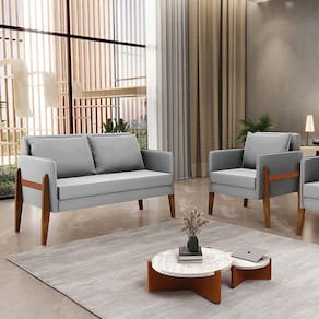 Ter uma casa com móveis de qualidade e que dure por anos é o sonho de qualquer pessoa. Afinal, quem não gosta de estar em um ambiente que transmita a sensação de acolhimento não é mesmo? Com este Kit 01 Namoradeira e 01 Poltrona Lana, você consegue levar aconchego e leveza a qualquer ambiente. Confeccionado em madeira de eucalipto proveniente de reflorestamento, suportando em média até 120 Kg, garantindo uma maior resistência e durabilidade ao conjunto, revestido em tecido Suede no tom Cinza, o estofamento do assento e encosto é composto de espuma D-23, na lateral vem com uma tira de corano, que dá um charme todo especial ao produto. Olha só que legal, as almofadas soltas além de serem totalmente confortáveis e extremamente macias, dão a opção de mudar a cara do ambiente quando quiser. Então, que tal aproveitar a nossa super novidade? Aproveite!