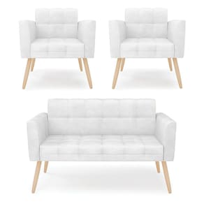 Você gosta de colecionar vários momentos memoráveis com sua família e amigos? Que tal recebê-los, com móveis de altíssima qualidade que só a D'Rossi tem? O Kit 01 Namoradeira e 02 Poltronas Elisa é adequado para você! Seu design retrô é a grande tendência do momento. Pode ser utilizado em diversos espaços da casa, em salas, hall de entrada, quartos, cozinhas, varanda, sacada, escritório, dentre outros. Contém as seguintes características: A estrutura é feita de madeira de Eucalipto 100% de reflorestamento, e os Pés Palito Natural, além de serem resistentes e duráveis, suportam em média até 120 kg. Assento, encosto e braços, contém enchimento de espuma D-23 e é estofado em tecido Corano, no tom Branco, que oferece muito conforto e resistência ao sentar, com aquela sensação de maciez e aconchego. Possui também, detalhes de costura no encosto e assento, resultando em um acabamento impecável, conferindo muito mais valor e elegância ao seu espaço. Para complementar a decoração com esse lindo kit, a dica é utilizar mantas, almofadas ou vasinho de flor. E pronto, seu cantinho estará perfeito para descansar e relaxar! Aqui, você encontra várias opções, para que seus amigos e familiares se sintam acolhidos. Garanta já seu kit.