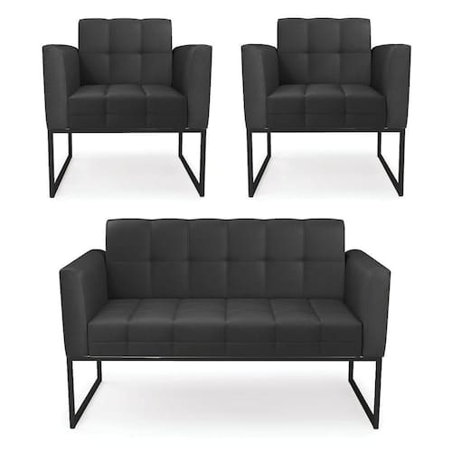 Você gosta de colecionar vários momentos memoráveis com sua família e amigos? Que tal recebê-los, com móveis de altíssima qualidade que só a DRossi tem? O Kit 01 Namoradeira e 02 Poltronas Elisa é adequado para você! Seu design retrô é a grande tendência do momento. Pode ser utilizado em diversos espaços da casa, em salas, hall de entrada, quartos, cozinhas, varanda, sacada, escritório, dentre outros. Contém as seguintes características: A estrutura é feita de madeira de Eucalipto 100% de reflorestamento, e a Base Metálica Industrial Preto, além de ser resistente e durável, suporta em média até 120 kg. Assento, encosto e braços, contém enchimento de espuma D-23 e é estofado em tecido Corino, que oferece muito conforto e resistência ao sentar, com aquela sensação de maciez e aconchego. Possui também, detalhes de costura no encosto e assento, resultando em um acabamento impecável, conferindo muito mais valor e elegância ao seu espaço. Para complementar a decoração com esse lindo kit, a dica é utilizar mantas, almofadas ou vasinho de flor. E pronto, seu cantinho estará perfeito para descansar e relaxar! Aqui, você encontra várias opções, para que seus amigos e familiares se sintam acolhidos. Garanta já seu kit.