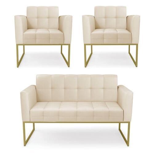 Você gosta de colecionar vários momentos memoráveis com sua família e amigos? Que tal recebê-los, com móveis de altíssima qualidade que só a DRossi tem? O Kit 01 Namoradeira e 02 Poltronas Elisa é adequado para você! Seu design retrô é a grande tendência do momento. Pode ser em diversos espaços da casa, em salas, hall de entrada, quartos, cozinhas, varanda, ada, escritório, dentre outros. Contém as seguintes características: A estrutura é feita de madeira de Eucalipto 100% de reflorestamento, e a Base Metálica Industrial Dourado, além de ser resistente e durável, suporta em média até 120 kg. Assento, encosto e braços, contém enchimento de espuma D-23 e é estofado em tecido Corino, no tom Bege, que oferece muito conforto e resistência ao sentar, com aquela sensação de maciez e aconchego. Possui também, detalhes de costura no encosto e assento, resultando em um acabamento impecável, conferindo muito mais valor e elegância ao seu espaço. Para complementar a decoração com esse lindo kit, a dica é utilizar mantas, almofadas ou vasinho de flor. E pronto, seu cantinho estará perfeito para descansar e relaxar! Aqui, você encontra várias opções, para que seus amigos e familiares se sintam acolhidos. Garanta já seu kit.