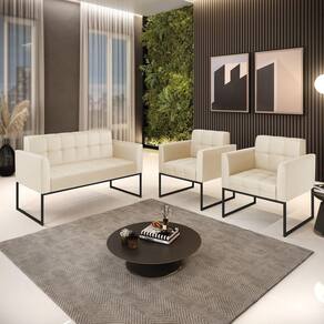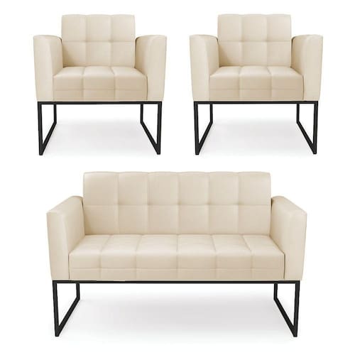 Você gosta de colecionar vários momentos memoráveis com sua família e amigos? Que tal recebê-los, com móveis de altíssima qualidade que só a DRossi tem? O Kit 01 Namoradeira e 02 Poltronas Elisa é adequado para você! Seu design retrô é a grande tendência do momento. Pode ser utilizado em diversos espaços da casa, em salas, hall de entrada, quartos, cozinhas, varanda, sacada, escritório, dentre outros. Contém as seguintes características: A estrutura é feita de madeira de Eucalipto 100% de reflorestamento, e a Base Metálica Industrial Preto, além de ser resistente e durável, suporta em média até 120 kg. Assento, encosto e braços, contém enchimento de espuma D-23 e é estofado em tecido Corino, no tom Bege, que oferece muito conforto e resistência ao sentar, com aquela sensação de maciez e aconchego. Possui também, detalhes de costura no encosto e assento, resultando em um acabamento impecável, conferindo muito mais valor e elegância ao seu espaço. Para complementar a decoração com esse lindo kit, a dica é utilizar mantas, almofadas ou vasinho de flor. E pronto, seu cantinho estará perfeito para descansar e relaxar! Aqui, você encontra várias opções, para que seus amigos e familiares se sintam acolhidos. Garanta já seu kit.