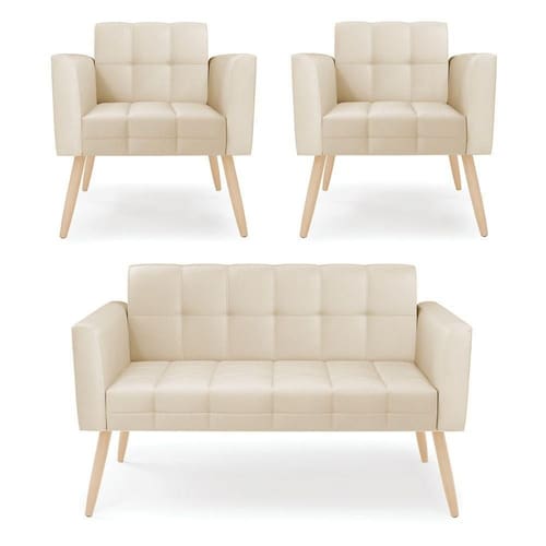 Você gosta de colecionar vários momentos memoráveis com sua família e amigos? Que tal recebê-los, com móveis de altíssima qualidade que só a DRossi tem? O Kit 01 Namoradeira e 02 Poltronas Elisa é adequado para você! Seu design retrô é a grande tendência do momento. Pode ser em diversos espaços da casa, em salas, hall de entrada, quartos, cozinhas, varanda, ada, escritório, dentre outros. Contém as seguintes características: A estrutura é feita de madeira de Eucalipto 100% de reflorestamento, e os Pés Palito , além de serem resistentes e duráveis, suportam em média até 120 kg. Assento, encosto e braços, contém enchimento de espuma D-23 e é estofado em tecido Corino, no tom Bege, que oferece muito conforto e resistência ao sentar, com aquela sensação de maciez e aconchego. Possui também, detalhes de costura no encosto e assento, resultando em um acabamento impecável, conferindo muito mais valor e elegância ao seu espaço. Para complementar a decoração com esse lindo kit, a dica é utilizar mantas, almofadas ou vasinho de flor. E pronto, seu cantinho estará perfeito para descansar e relaxar! Aqui, você encontra várias opções, para que seus amigos e familiares se sintam acolhidos. Garanta já seu kit.