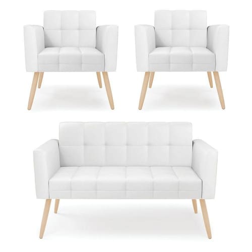 Você gosta de colecionar vários momentos memoráveis com sua família e amigos? Que tal recebê-los, com móveis de altíssima qualidade que só a DRossi tem? O Kit 01 Namoradeira e 02 Poltronas Elisa é adequado para você! Seu design retrô é a grande tendência do momento. Pode ser em diversos espaços da casa, em salas, hall de entrada, quartos, cozinhas, varanda, ada, escritório, dentre outros. Contém as seguintes características: A estrutura é feita de madeira de Eucalipto 100% de reflorestamento, e os Pés Palito , além de serem resistentes e duráveis, suportam em média até 120 kg. Assento, encosto e braços, contém enchimento de espuma D-23 e é estofado em tecido Corino, no tom Branco, que oferece muito conforto e resistência ao sentar, com aquela sensação de maciez e aconchego. Possui também, detalhes de costura no encosto e assento, resultando em um acabamento impecável, conferindo muito mais valor e elegância ao seu espaço. Para complementar a decoração com esse lindo kit, a dica é utilizar mantas, almofadas ou vasinho de flor. E pronto, seu cantinho estará perfeito para descansar e relaxar! Aqui, você encontra várias opções, para que seus amigos e familiares se sintam acolhidos. Garanta já seu kit.