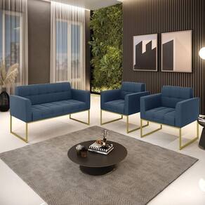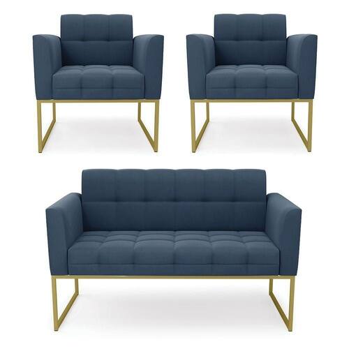 Você gosta de colecionar vários momentos memoráveis com sua família e amigos? Que tal recebê-los, com móveis de altíssima qualidade que só a DRossi tem? O Kit 01 Namoradeira e 02 Poltronas Elisa é adequado para você! Seu design retrô é a grande tendência do momento. Pode ser em diversos espaços da casa, em salas, hall de entrada, quartos, cozinhas, varanda, ada, escritório, dentre outros. Contém as seguintes características: A estrutura é feita de madeira de Eucalipto 100% de reflorestamento, e a Base Industrial Metálica Dourada, além de ser resistente e durável, suporta em média até 120 kg. Assento, encosto e braços, contém enchimento de espuma D-23 e é estofado em tecido Suede, no tom Azul Marinho, que oferece muito conforto e resistência ao sentar, com aquela sensação de maciez e aconchego. Possui também, detalhes de costura no encosto e assento, resultando em um acabamento impecável, conferindo muito mais valor e elegância ao seu espaço. Para complementar a decoração com esse lindo kit, a dica é utilizar mantas, almofadas ou vasinho de flor. E pronto, seu cantinho estará perfeito para descansar e relaxar! Aqui, você encontra várias opções, para que seus amigos e familiares se sintam acolhidos. Garanta já seu kit.