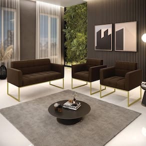 Você gosta de colecionar vários momentos memoráveis com sua família e amigos? Que tal recebê-los, com móveis de altíssima qualidade que só a DRossi tem? O Kit 01 Namoradeira e 02 Poltronas Elisa é adequado para você! Seu design retrô é a grande tendência do momento. Pode ser em diversos espaços da casa, em salas, hall de entrada, quartos, cozinhas, varanda, sacada, escritório, dentre outros. Contém as seguintes características: A estrutura é feita de madeira de Eucalipto 100% de reflorestamento, e a Base Industrial Metálica Dourada, além de ser resistente e durável, suporta em média até 120 kg. Assento, encosto e braços, contém enchimento de espuma D-23 e é estofado em tecido Suede, que oferece muito conforto e resistência ao sentar, com aquela sensação de maciez e aconchego. Possui também, detalhes de costura no encosto e assento, resultando em um acabamento impecável, conferindo muito mais valor e elegância ao seu espaço. Para complementar a decoração com esse lindo kit, a dica é utilizar mantas, almofadas ou vasinho de flor. E pronto, seu cantinho estará perfeito para descansar e relaxar! Aqui, você encontra várias opções, para que seus amigos e familiares se sintam acolhidos. Garanta já seu kit.
