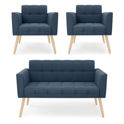 Kit 1 Sofá Namoradeira E 2 Poltronas Elisa Suede Pés Palito Natural - D`rossi Cor Azul Marinho - Blush