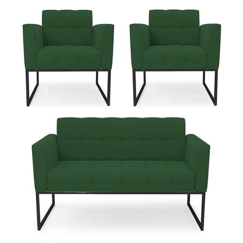 Kit 1 Sofá Namoradeira e 2 Poltronas Elisa Veludo Base Metálica Industrial Preto - D`Rossi - Verde