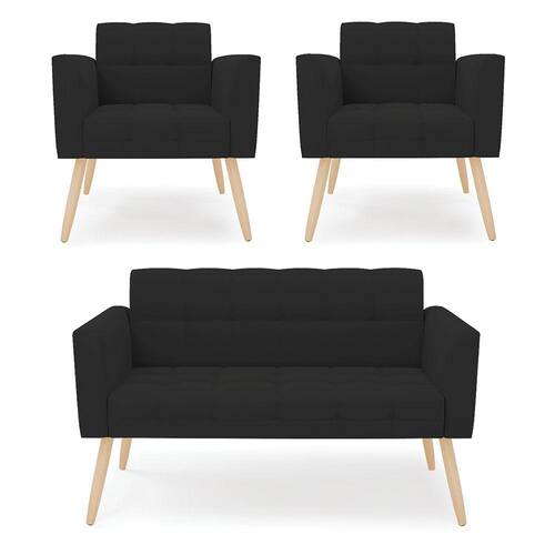 Você gosta de colecionar vários momentos memoráveis com sua família e amigos? Que tal recebê-los, com móveis de altíssima qualidade que só a D'Rossi tem? O Kit 01 Namoradeira e 02 Poltronas Elisa é adequado para você! Seu design retrô é a grande tendência do momento. Pode ser utilizado em diversos espaços da casa, em salas, hall de entrada, quartos, cozinhas, varanda, sacada, escritório, dentre outros. Contém as seguintes características: A estrutura é feita de madeira de Eucalipto 100% de reflorestamento, e os Pés Palito Natural, além de serem resistentes e duráveis, suportam em média até 120 kg. Assento, encosto e braços, contém enchimento de espuma D-23 e é estofado em tecido Veludo, no tom Preto, que oferece muito conforto e resistência ao sentar, com aquela sensação de maciez e aconchego. Possui também, detalhes de costura no encosto e assento, resultando em um acabamento impecável, conferindo muito mais valor e elegância ao seu espaço. Para complementar a decoração com esse lindo kit, a dica é utilizar mantas, almofadas ou vasinho de flor. E pronto, seu cantinho estará perfeito para descansar e relaxar! Aqui, você encontra várias opções, para que seus amigos e familiares se sintam acolhidos. Garanta já seu kit.