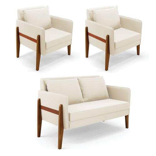 Ter uma casa com móveis de qualidade e que dure por anos é o sonho de qualquer pessoa. Afinal, quem não gosta de estar em um ambiente que transmita a sensação de acolhimento não é mesmo? Com este Kit 01 Namoradeira e 02 Poltronas Lana, você consegue levar aconchego e leveza a qualquer ambiente. Confeccionado em madeira de eucalipto proveniente de reflorestamento, suportando em média até 120 Kg, garantindo uma maior resistência e Veludo no tom Bege, o estofamento do assento e encosto é composto de espuma D-23, na lateral vem com uma tira de corano, que dá um charme todo especial ao produto. Olha só que legal, as almofadas soltas além de serem totalmente confortáveis e extremamente macias, dão a opção de mudar a cara do ambiente quando quiser. Então, que tal aproveitar a nossa super novidade? Aproveite!