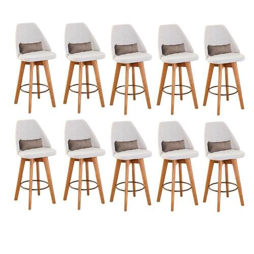 Kit 10 Banquetas Alta Maya Giratória Com Encosto Linho Bege Claro E Almofada Corino Bege - Gat Magazine Banqueta Maya Giratória - GAT MAGAZINE A Banqueta Maya possui assento e pés em madeira eucalipto com sistema giratório! Os pés contam com um reforço que proporciona um suporte de peso de até 120 Kgs.O assento é revestido com espuma D-23. Além de bonita e charmosa, vai trazer para seu ambiente elegância e proporcionará conforto para sua família e amigos nos momentos de lazer.