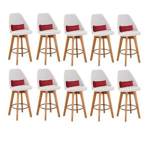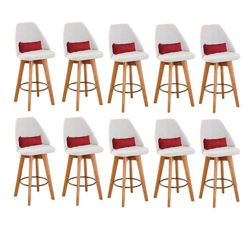 Kit 10 Banquetas Alta Maya Giratória Com Encosto Linho Bege Claro E Almofada Sintético Vermelho - Gat Magazine Banqueta Maya Giratória - GAT MAGAZINE A Banqueta Maya possui assento e pés em madeira eucalipto com sistema giratório! Os pés contam com um reforço que proporciona um suporte de peso de até 120 Kgs.O assento é revestido com espuma D-23. Além de bonita e charmosa, vai trazer para seu ambiente elegância e proporcionará conforto para sua família e amigos nos momentos de lazer.