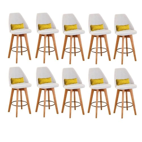 Kit 10 Banquetas Alta Maya Giratória Com Encosto Gourmet Linho Bege E Almofada Sintético Amarelo - Gat Magazine Banqueta Maya Giratória - GAT MAGAZINE A Banqueta Maya possui assento e pés em madeira eucalipto com sistema giratório! Os pés contam com um reforço que proporciona um suporte de peso de até 120 Kgs.O assento é revestido com espuma D-23. Além de bonita e charmosa, vai trazer para seu ambiente elegância e proporcionará conforto para sua família e amigos nos momentos de lazer.