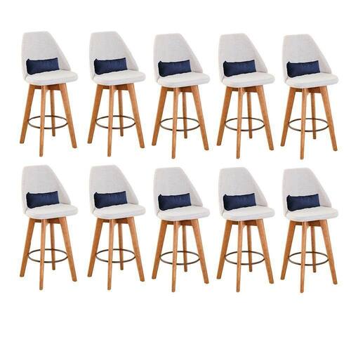 Kit 10 Banquetas Alta Maya Giratória Com Encosto Gourmet Linho Bege E Almofada Suede Azul Marinho - Gat Magazine Banqueta Maya Giratória - GAT MAGAZINE A Banqueta Maya possui assento e pés em madeira eucalipto com sistema giratório! Os pés contam com um reforço que proporciona um suporte de peso de até 120 Kgs.O assento é revestido com espuma D-23. Além de bonita e charmosa, vai trazer para seu ambiente elegância e proporcionará conforto para sua família e amigos nos momentos de lazer.