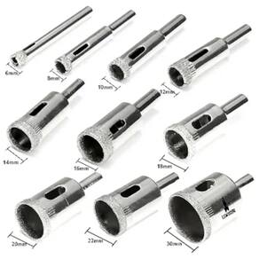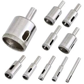 Kit com 10 Brocas diamantadas Lorben de 6mm a 30mm revestidas que furam um círculo completo em vidros, mármores, granitos, espelhos, garrafas, pisos, azulejos, cerâmicas e madeiras.