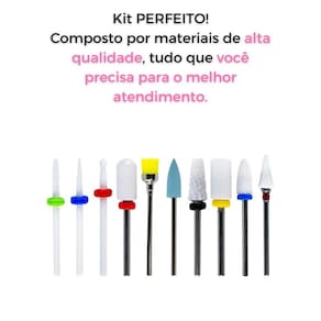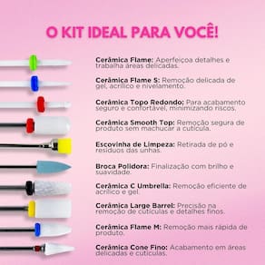 Contém: 01 - Broca Cerâmica C Umbrella 01 - Broca Cerâmica Cone Fino 01 - Broca Cerâmica Flame 01 - Broca Cerâmica Flame S 01 - Broca Cerâmica Flame M 01 - Broca Cerâmica Large Barrel 01 - Broca Escovinha de Limpeza 01 - Broca Polidora 01 - Broca Cerâmica Smooth Top 01 - Broca Cerâmica Topo Redondo 01 - Caixa Organizadora com 10 Divisórias de Brocas. O kit ideal para manicures Perfeito para todos os atendimentos, composto por cortes de granulação Azul - Média, Amarela Super Fina, Vermelha - Fina, Verde Claro indica uma granulação Grossa e Preto - Muito Grossa. Composto por modelos em cerâmica, escovinha de limpeza e broca polidora. Compatíveis com diversos modelos de lixadeiras e canetas. Indicado para profissionais que buscam precisão e eficácia em todas as etapas do alongamento, desde a remoção até o acabamento final. Cada broca foi projetada para uma função específica, garantindo versatilidade e resultado impecável: Broca Cerâmica C Umbrella: Formato de guarda-chuva, ideal para remoção de gel e acrílico. Broca Cerâmica Cone Fino: Fina e alongada, perfeita para acabamentos e cutículas. Broca Cerâmica Flame: Formato chama, versátil para remoção e refinamento. Broca Cerâmica Flame S: Versão mais suave da Flame, para remoção delicada. Broca Cerâmica Flame M: Média abrasividade, para remoção mais eficiente. Broca Cerâmica Large Barrel: Cilíndrica, ideal para nivelamento e remoção rápida. Broca Escovinha de Limpeza: Remove resíduos e pó das unhas. Broca Polidora: Dá brilho e acabamento suave às unhas. Broca Cerâmica Smooth Top: Com topo arredondado, segura para cutículas e remoção uniforme. Broca Cerâmica Topo Redondo: Semelhante à Smooth Top, Utilizado para acabamento sem agredir a pele. Características Principais: - 10 modelos de brocas; - Ideal para manicure, pedicure e podólogos; - Material de alta qualidade; - Acompanha caixa que organiza até 10 brocas com divisória; - Brocas de granulação: Média, Super Fina, Fina, Grossa e Muito Grossa; - Escovinha de limpeza; - Broca polidora; - Kit completo que atende todas as técnicas. Boas Compras ; Marca: Arte Seducao
