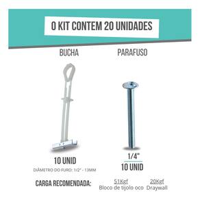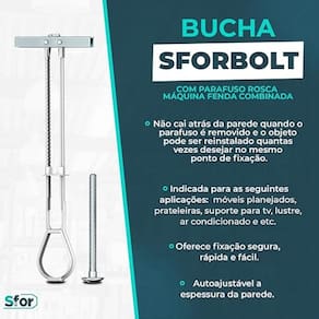 Ficha Técnica: Marca: SFOR Modelo: Bucha SFORBOLT Diâmetro Nominal: 1/4 polegadas Material: Nylon de alta resistência e Parafuso de metal Diâmetro do furo: 1/2 13 mm Comprimento do parafuso: 63 mm Diâmetro do parafuso: 1/4 x 2.1/2mm Espessura da base de fixação: 10 á 57 mm Carga Recomendada Drywall : 20 Kgf Carga Recomendada Bloco Concreto: 55 Kgf Quantidade: 10 Kits (20 pçs) Tipo de Fixação: Paredes ocas (Drywall e Gesso)