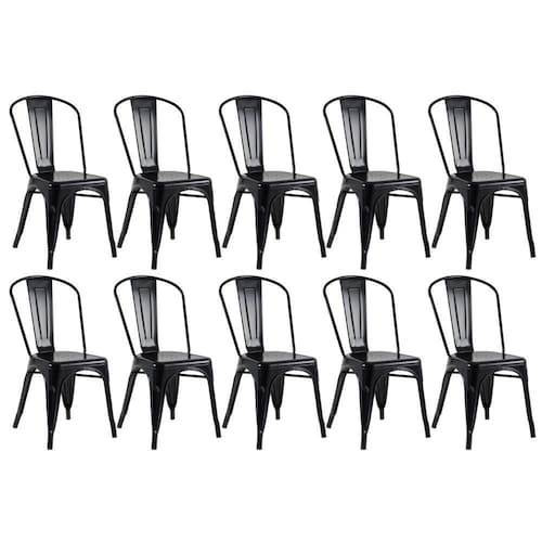 Kit 10 Cadeiras Iron Tolix - Preto Cadeira modelo Tolix: Material: Aço carbono (Pintura epoxi eletrostática) - Altura do encosto: 84 cm - Altura do assento: 44 cm - Largura do assento: 36 cm - Profundidade do assento: 36 cm - Distância entre os pés: 42 cm - Peso suportado: 130 kg.