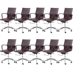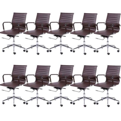 Kit 10 Cadeiras para Escritório Diretor Esteirinha com Relax Sintético 3301 Or Design A Cadeira OR-3301 tem uma estrutura metalizada cromada com rodízios em PU que não danificam o piso, sistema relax com travamento, assento e detalhes no encosto dos braços em PU. Uma excelente escolha, agregando estilo e conforto para seu escritório. Cadeira resistente, suporta até 120 kg. Altura do Conjunto: 97 cm Ambiente: null Ambiente Principal: Escritório Cor: Café Informação Complementar: 1x Kit 2 Cadeiras Esteirinha Baixa Giratória Office Eames Café/CromadoLargura: 61 cmAltura: 97 cmPeso: 14,75 kgProfundidade: 46 cmNecessita Montagem: Sim2x Conjunto 4 Cadeiras de Escritório com Rodízios Esteirinha Baixa Sintético CaféLargura: 61Altura: 92Peso: 12.19Profundidade: 46.5Necessita Montagem: Sim Possui Rodízio: Sim
