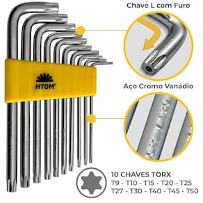 Jogo de chave torx l com furo guia longa 10 peças t9 a t50 aço cromo vanádio htom Kit de chave allen fabricadas em aço cromo vanádio com perfil do corpo em l permite efeito de alavanca durante o aperto, nas bitolas: t9, t10, t15, t20, t25, t27, t30, t40, t45 e t50 - marca: htom - referência: htom-42526 - 10 chaves torx nas medidas: t9 - t10 - t15 - t20 - t25 - t27 - t30 - t40 - t45 - t50 - com furo guia - fabricadas em aço cromo vanádio - perfil do corpo em l permite efeito de alavanca durante o aperto - utilizadas para aperto e desaperto em parafusos com perfil tork interno - - acompanha suporte plástico - os produtos htom são fabricados com materiais de última geração, proporcionando maior durabilidade, força e precisão - : 90 dias