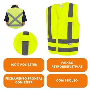- Tecido 100% poliéster - Fechamento frontal em zíper - Visibilidade em 360° graus - Faixas retrorrefletivas - Visibilidade mesmo em longas distâncias