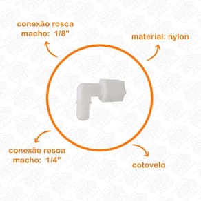 Dados Técnicos Material: Nylon; Cor: Branco; Conexão rosca macho: 1/8; Conexão para mangueira de: 1/4; Temperatura de trabalho: 40º C; Pressão máxima suportada: 7 kgf/cm2;