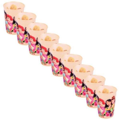 Dimensões diâmetro x Alt : 7,8x10,3 cm Volume :320,0 ml Estampas: As Princesas Quantidade: 10 unidades Composição: Plástico livre Bpa